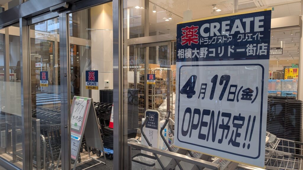 以前もこのブログで紹介させていただいた、ドラッグストアの「クリエイト」さんが相模大野のコリドー街にできるというお話。こちら、店名が相模大野コリドー街店となり、4月17日(金)にOPENすることになったようです。