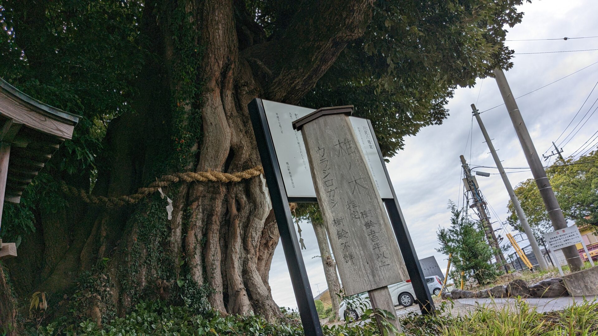 鳥居脇の椎の木は樹齢不明の大木となり、迫力のある姿を見せてくれます。
