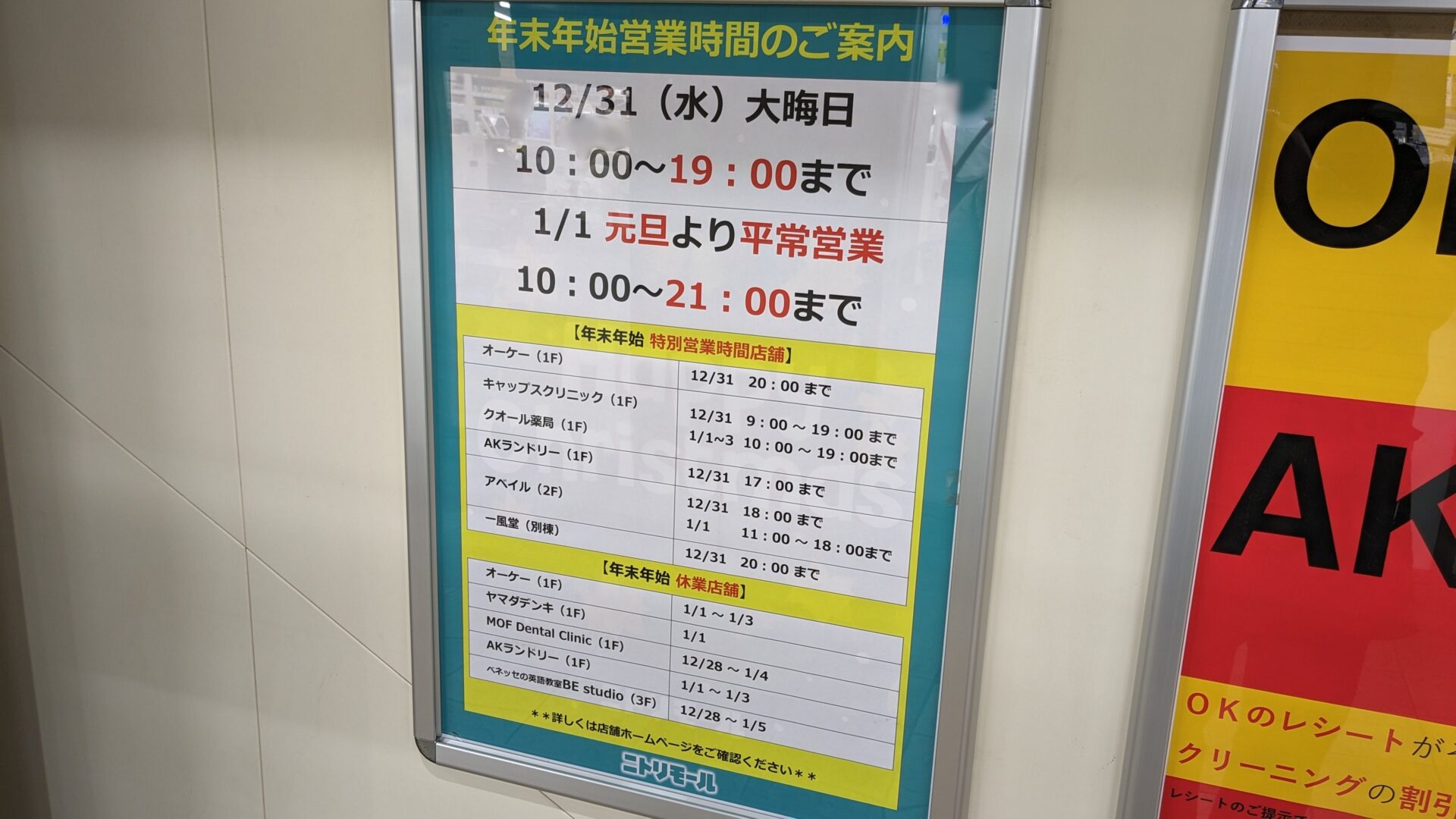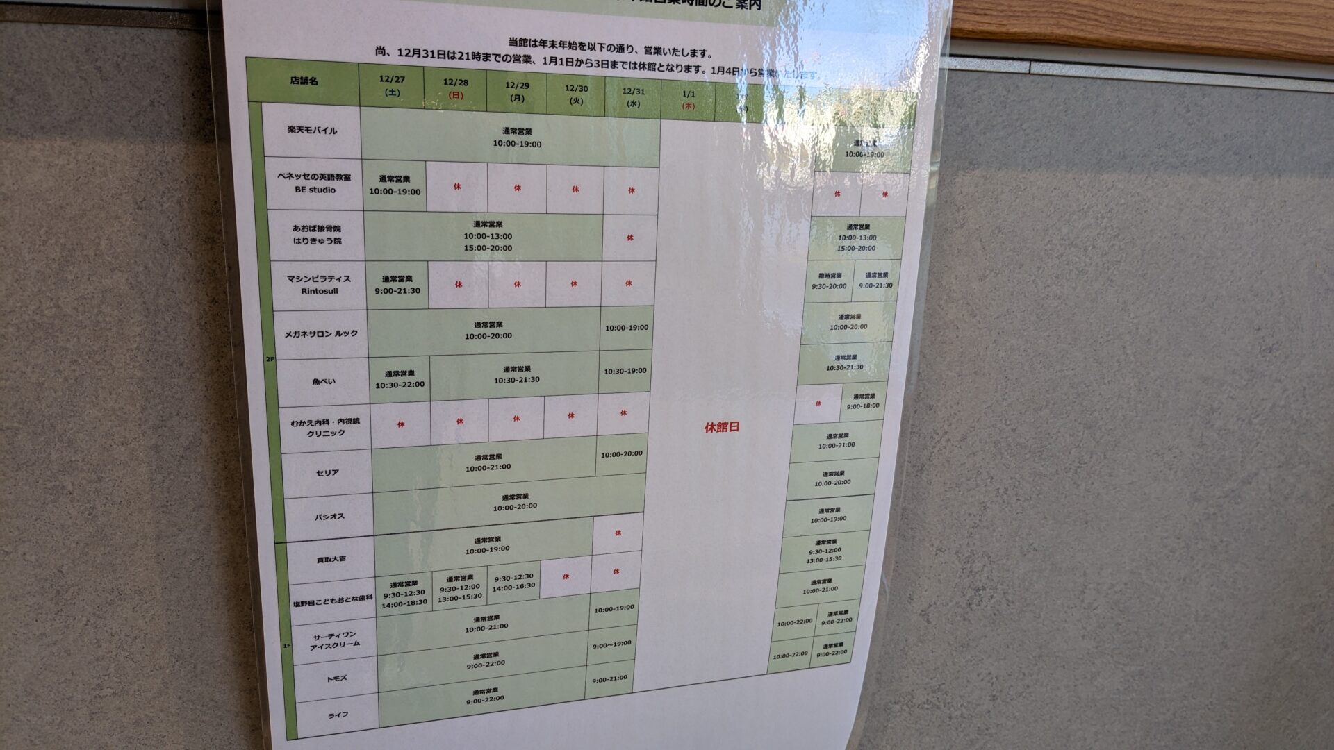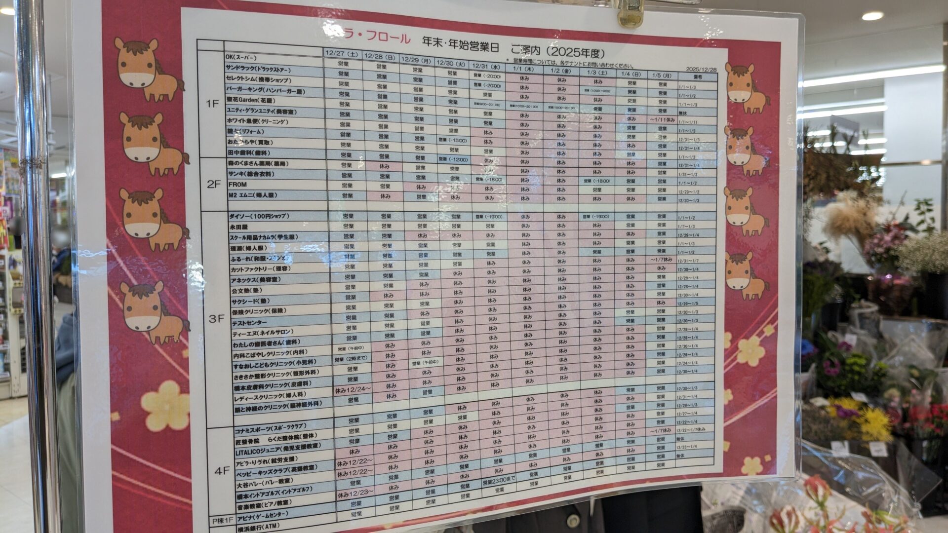 「ラ・フロール橋本」は「バーガーキング」さんや「橋本インドアゴルフ」さん、「APINA」さんなどは元日も営業されるようですが、そのほかの店舗は1月2日までは休業になるようです。