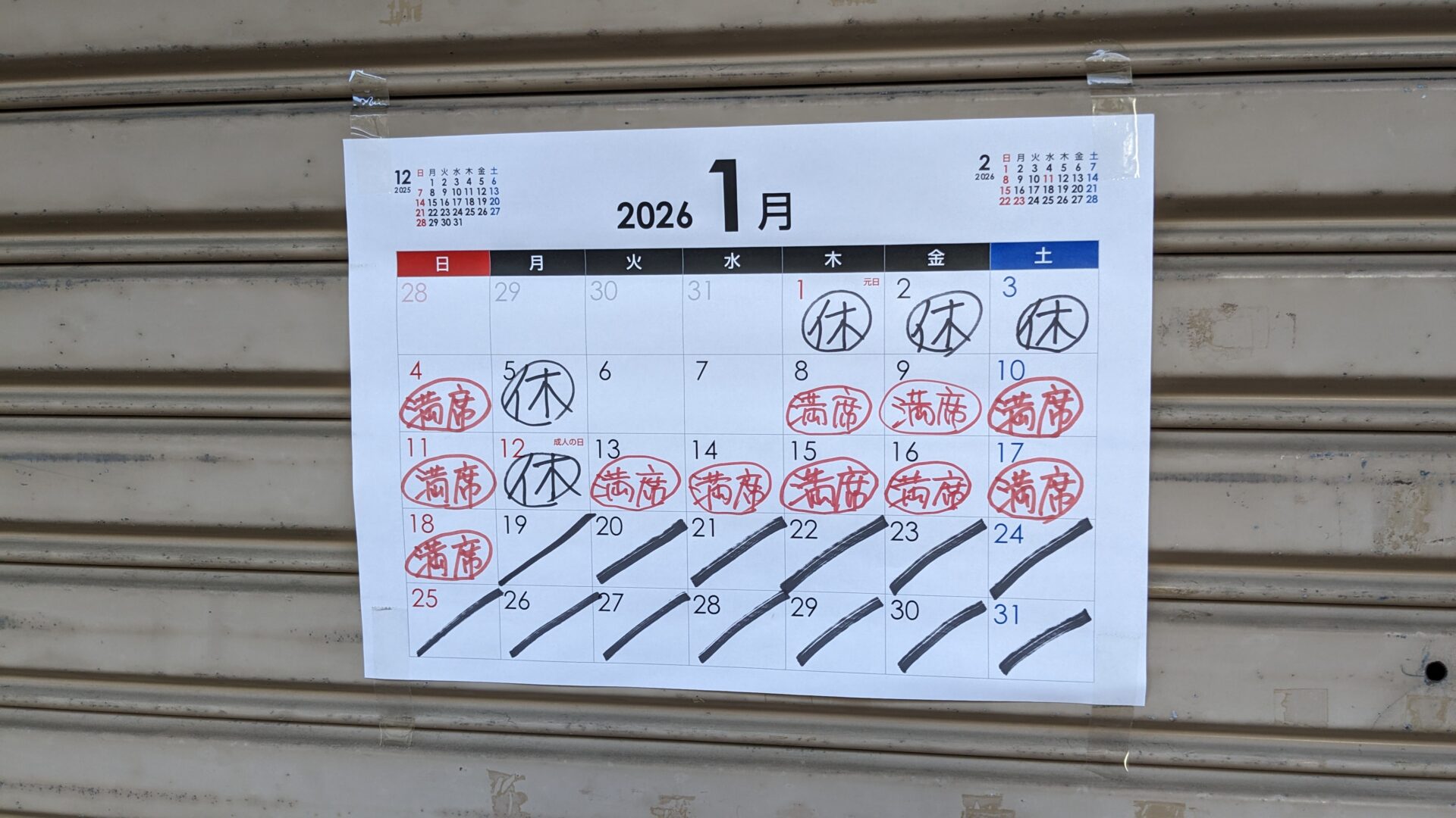 それもそのはずで、別日の開店前に近くを通りかかった際に写真に収めた営業カレンダーが ↓ です。今月はすべて 満席 の文字が並んでいました。