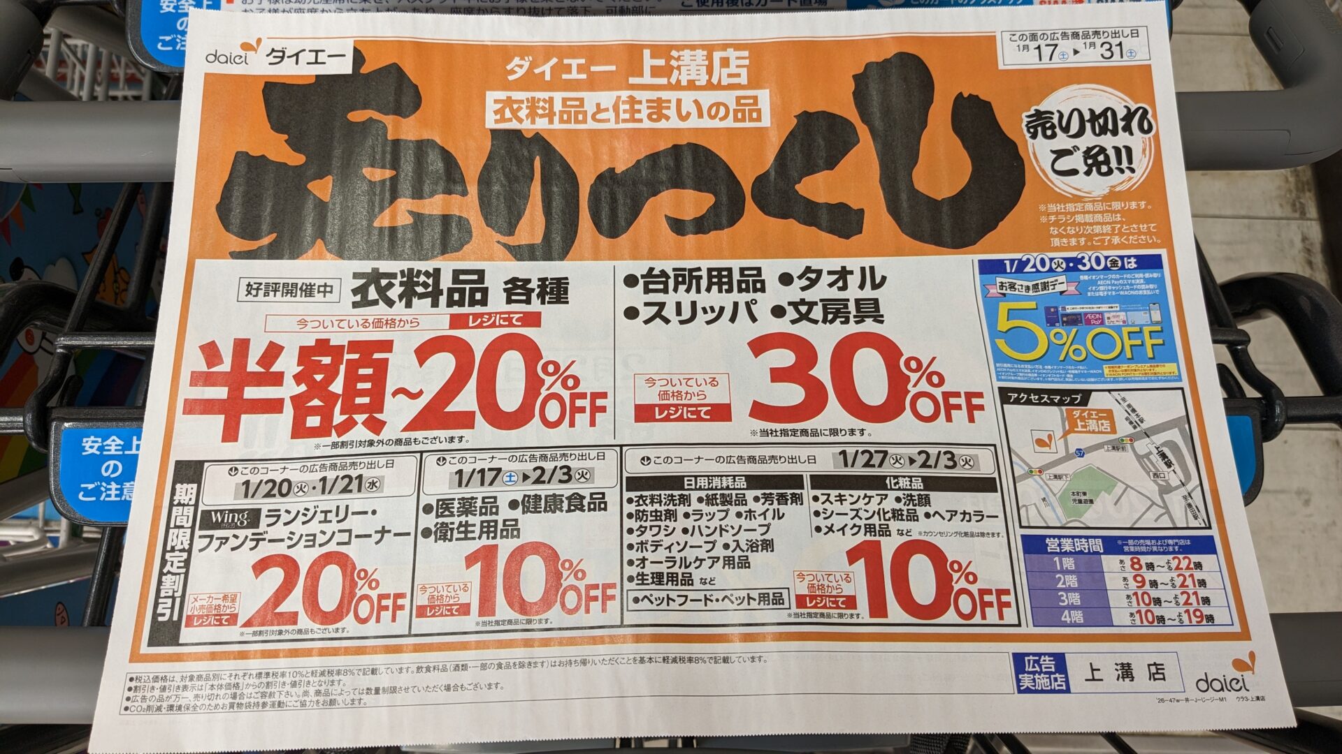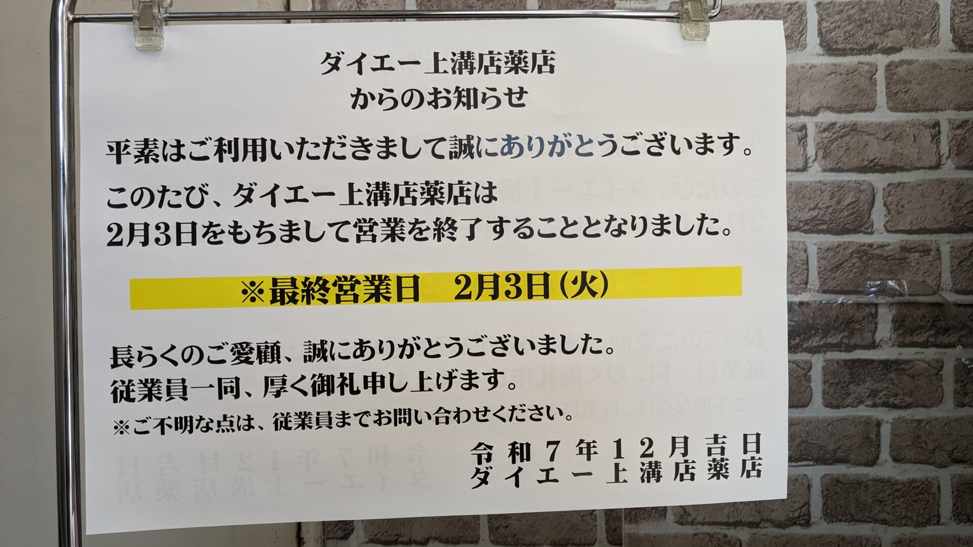 ということで、「ダイエー」上溝店さんが2月下旬に閉店 という記事でした。上溝駅周辺では同規模のスーパーはなく、周辺に住まわれる方にとってはかなり影響のある閉店になるのではないかと思います。