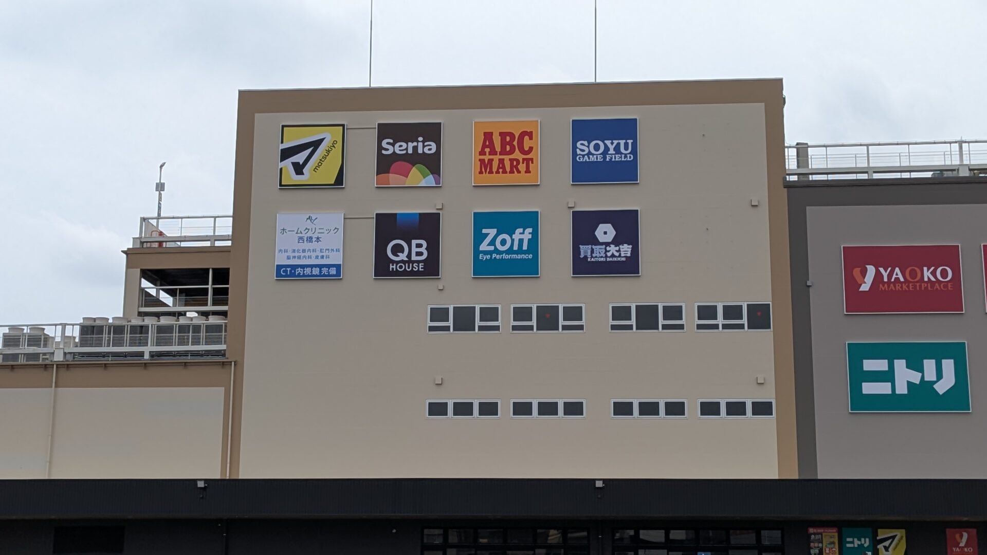 もう少し寄りで。新たに「ABC MART」さん、「ホームクリニック西橋本」さん、「Zoff」さん、「QB House」さん、「買取大吉」さんの出店が確認できます。看板の空きスペース的に、もう2テナントくらいの告知がされるのでしょうか。