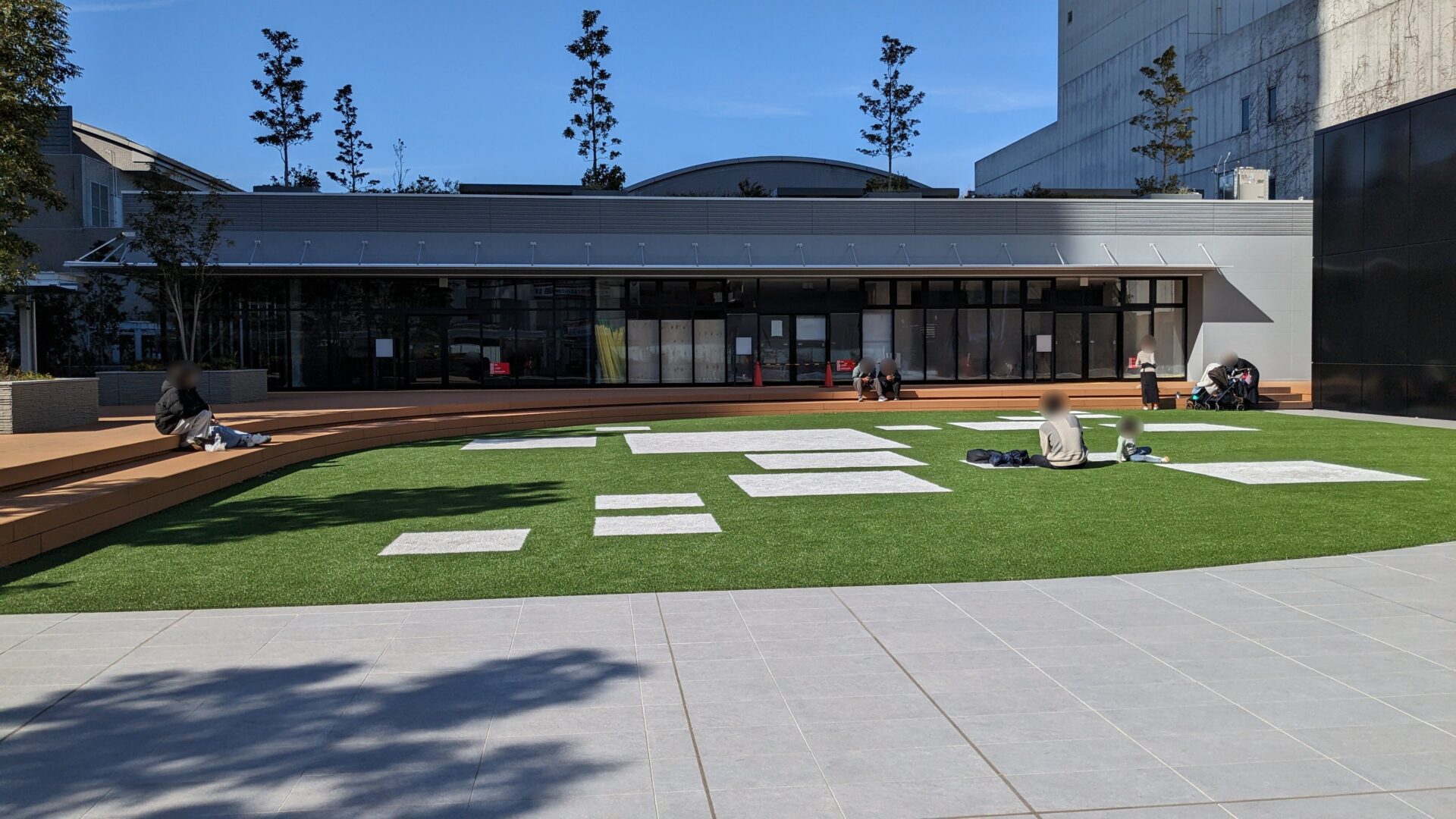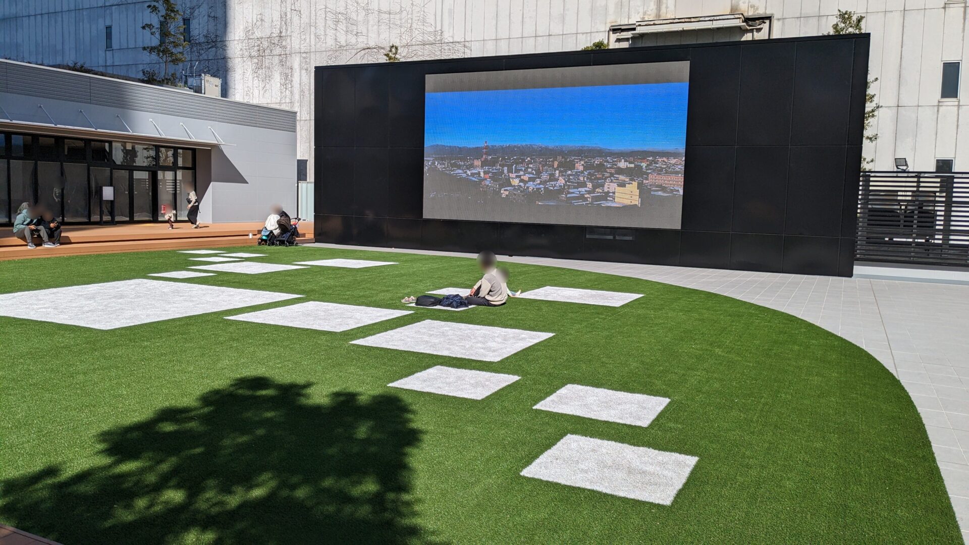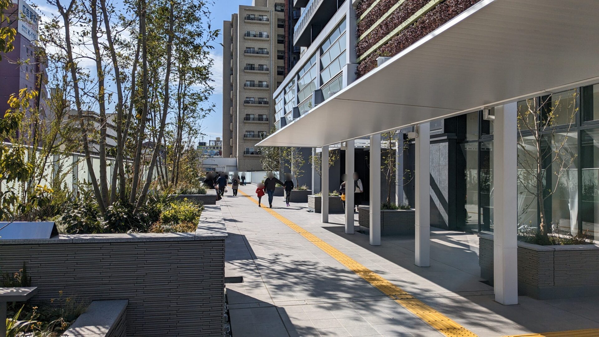 広場と大型ビジョンも設置されていて、晴れた日はここでゆったりできそうです。またこの公共歩廊の各所に、ベンチのような設備が点在しています。
