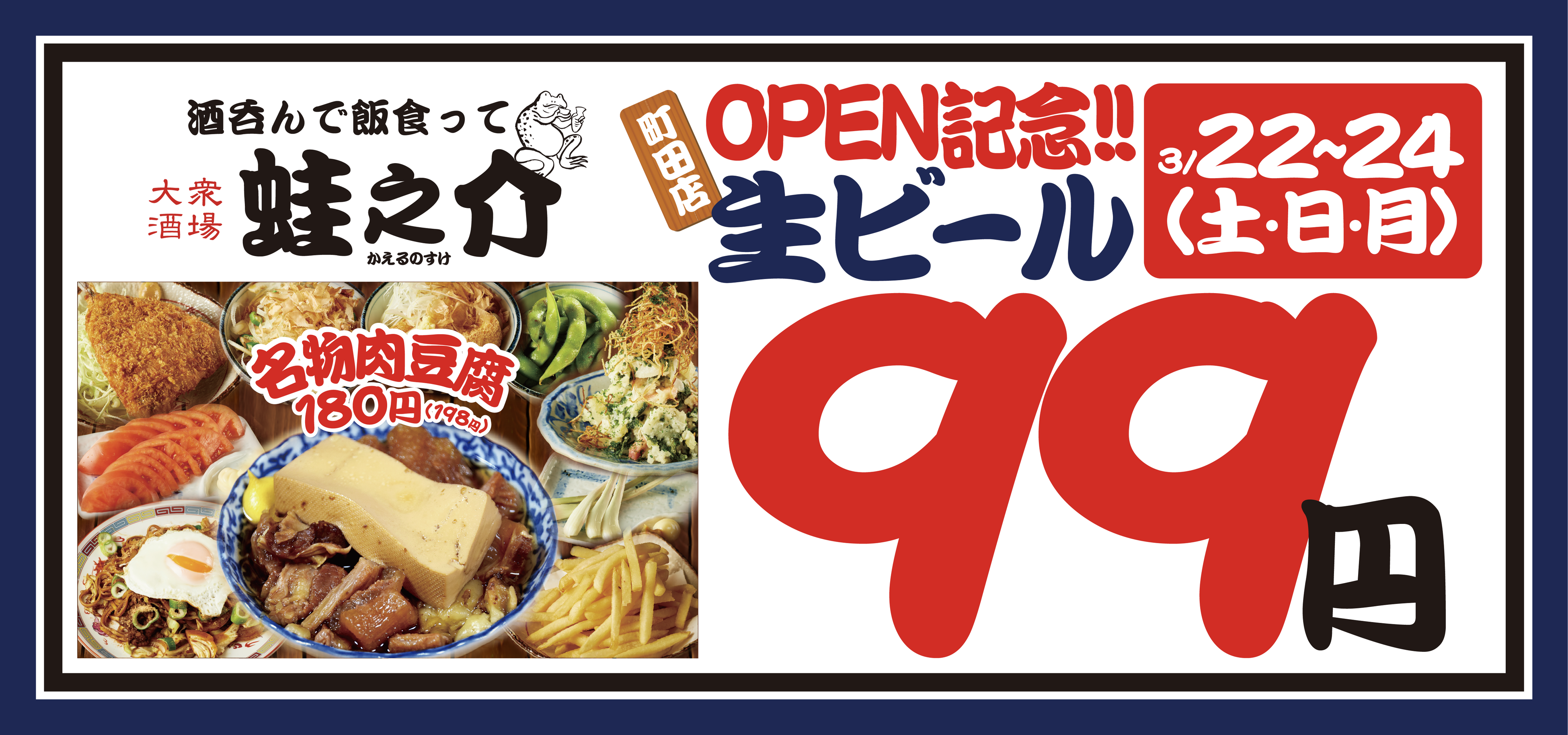 3月22日(土)に、小田急町田駅近くに大衆酒場「酒呑んで飯食って 蛙之介」町田店さんがOPENされました。場所は ↓ になります。