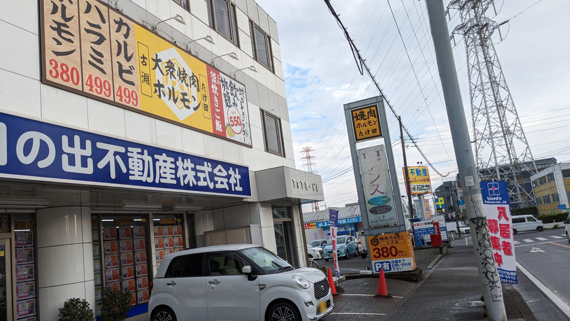 現地の様子です。近くには「松屋」さんや「コメダ珈琲」さんがある立地となります。駅徒歩2分以内といったところでしょうか。「日の出不動産」さんの2階になります。