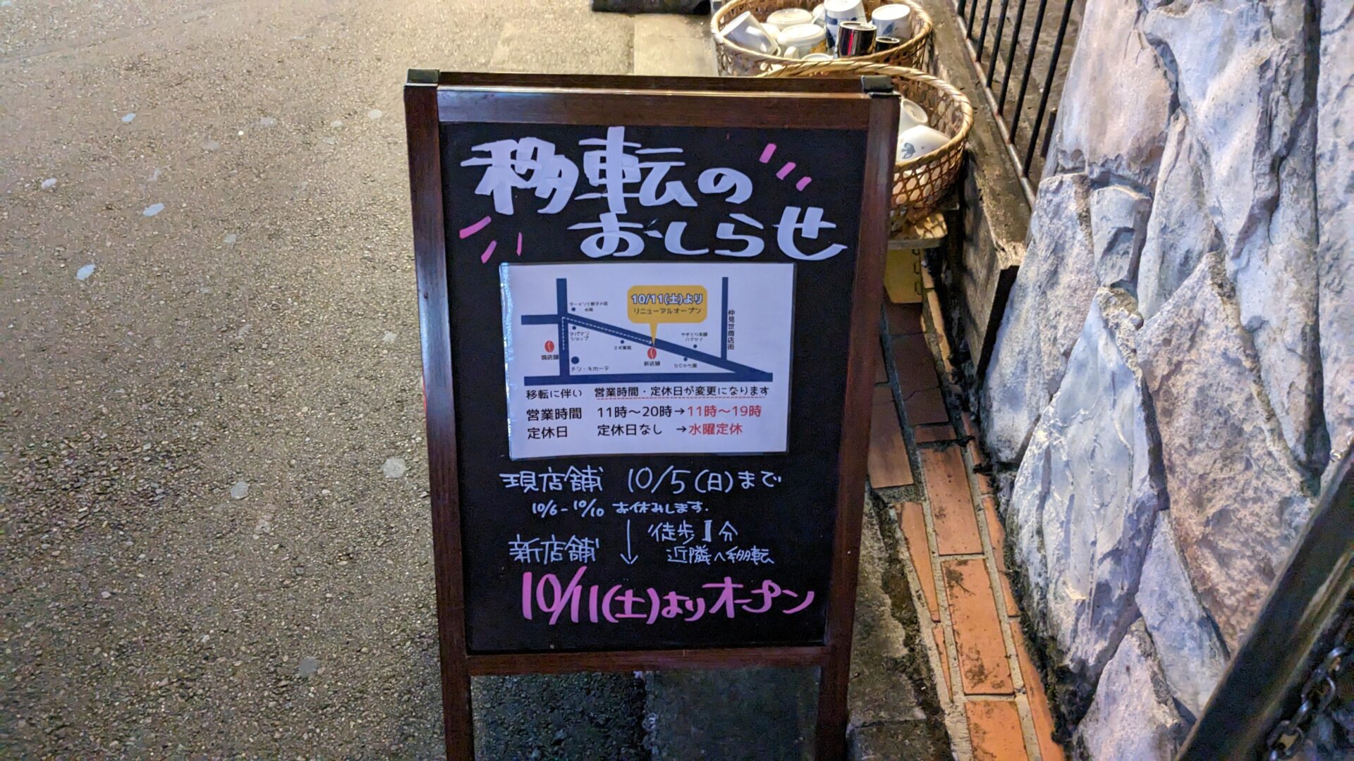 10/11(土)には移転先での営業となる告知がされていました。移転後は営業時間等が変わることも記載されていました。